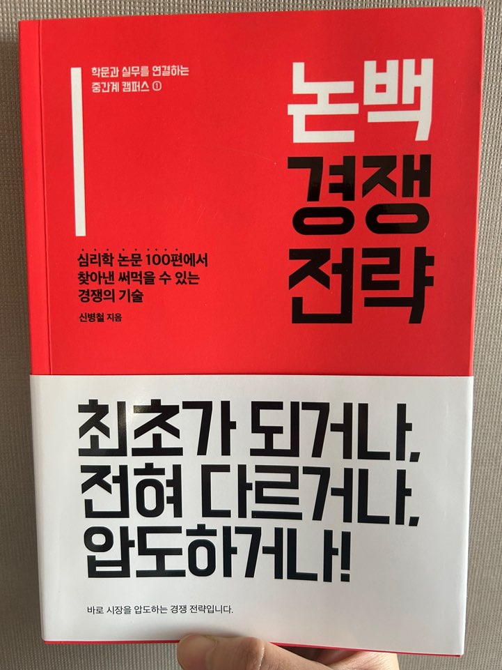 논백 경쟁 전략은 심리학 논문 100편에서 찾아낸 써먹을 수 있는 경쟁 기술, 전략입니다. 지금의 시장은 블루오션을 찾기가 매우 어렵습니다. 멀리 있는 것을 찾으려고 애쓰기보다는,현재 어떤 새로운 대안을 제시할 수 있을지를 고민해야 한다고 말합니다. 다시 말해, 블루오션을 찾기보다는 레드 오션에서 살아남는 법을 고민하는 게 좀 더 현실적이라는 말입니다.