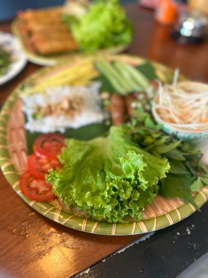 넴루이는 라이스페이퍼에 상추, 민트, 쌀국수, 고기, 파파야, 망고를 싸 먹는 음식입니다.