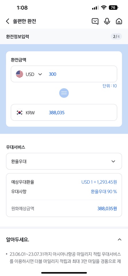 마일리지 적립으로 선택할 경우 환율 90% 우대는 적용되지 않더라고요!