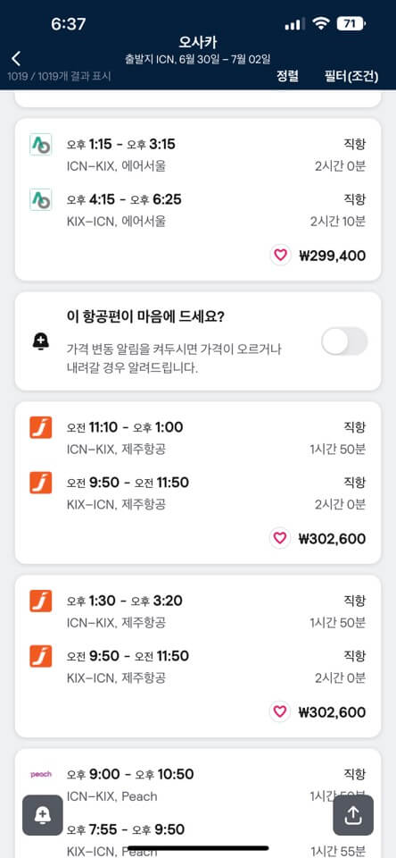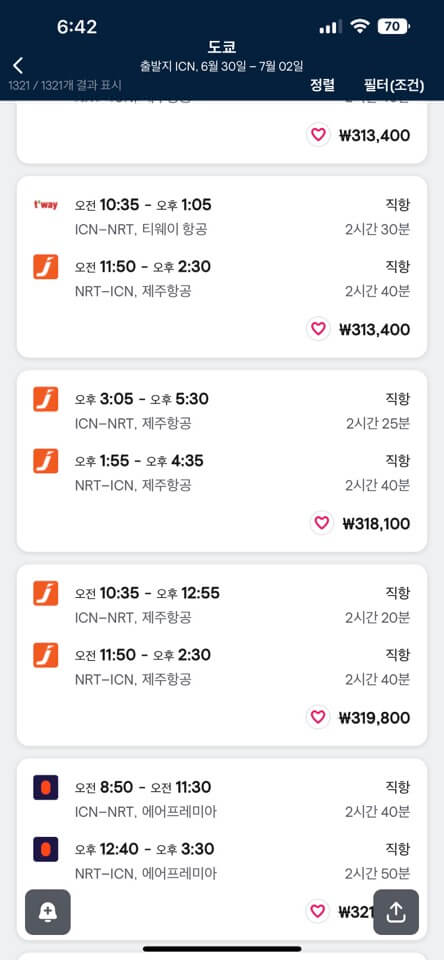 저희는 시간대, 가격, 수하물 등을 비교했을 때, 제주항공과 티웨이항공의 항공편이 제일 좋았습니다.