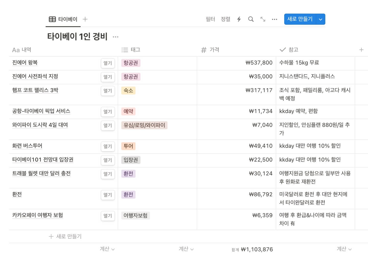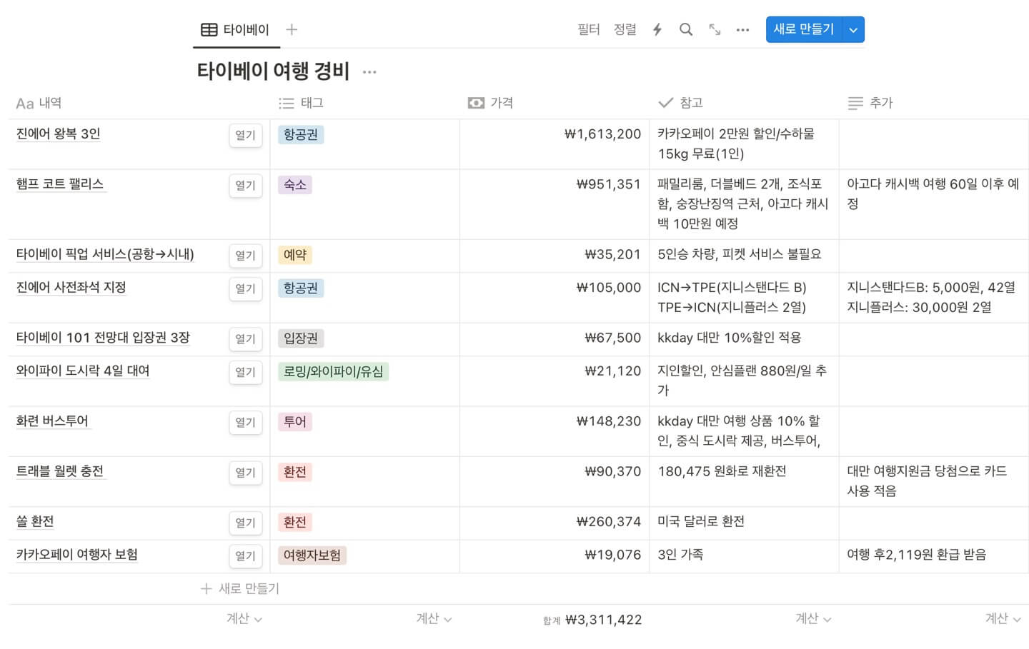 항공권, 숙소, 투어, 입장권이 이번 대만 타이베이 여행에서 가장 큰 비중을 차지했습니다.