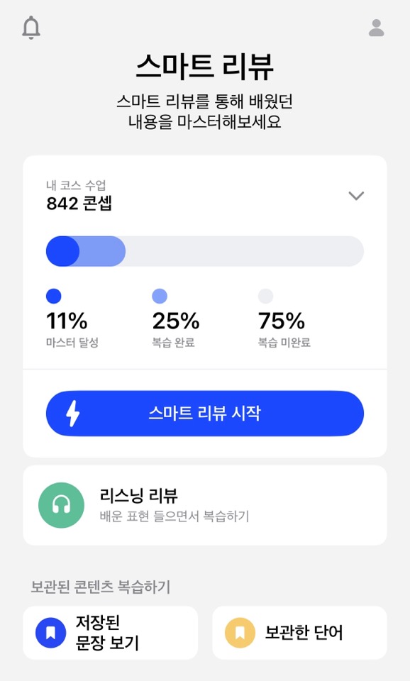 스픽의 장점은 하루치의 강의를 듣고 연습을 하면서 표현을 '저장'할 수 있다는 것입니다. 저는 특히 여러번 반복해서 스피킹해도 입에 잘 붙지 않거나 바로 기억나지 않는 문장을 저장해 둡니다. 저장한 문장은 위의 사진처럼, 리뷰탭에서 확인할 수 있습니다. 스마트 리뷰는 빠른 속도로 전에 배운 표현을 반복 스피킹합니다. 저는 복습을 많이 안 해서 까먹은 표현들이 더 많습니다....