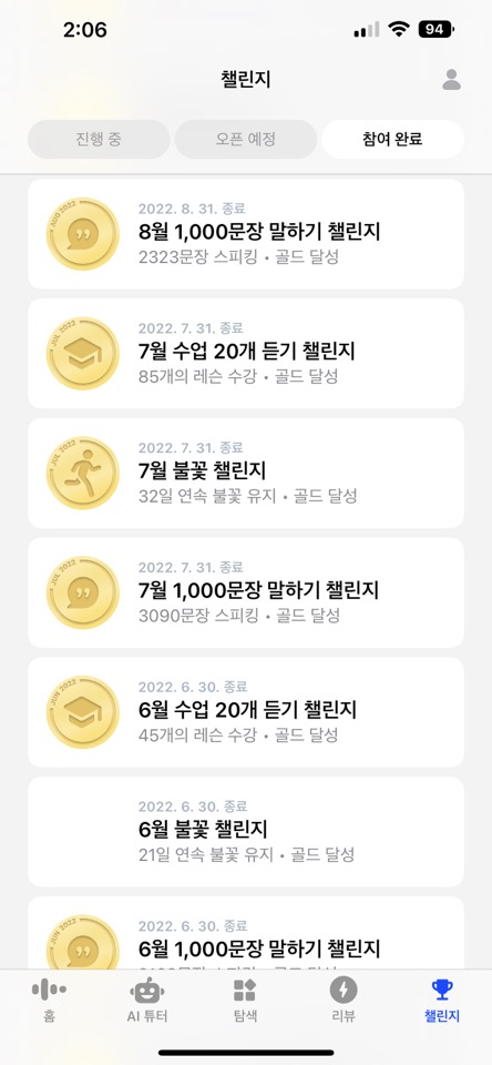 스픽에는 여러 종류의 챌린지가 존재합니다. 챌린지에 참여해서 완주하면, 추첨을 통해 경품을 받기도 합니다. 저는 아직까지 한 번도 당첨된 적은 없어요. 그래도 챌린지에 참여하면 더 열심히 어플을 사용하게 되기는 합니다. 브론즈-실버-골드 순으로 이어지고, 하나씩 달성할 때 뿌듯합니다.