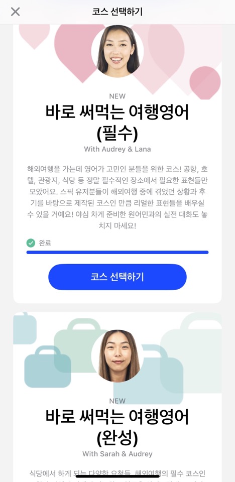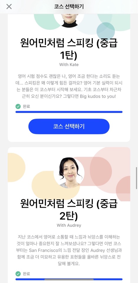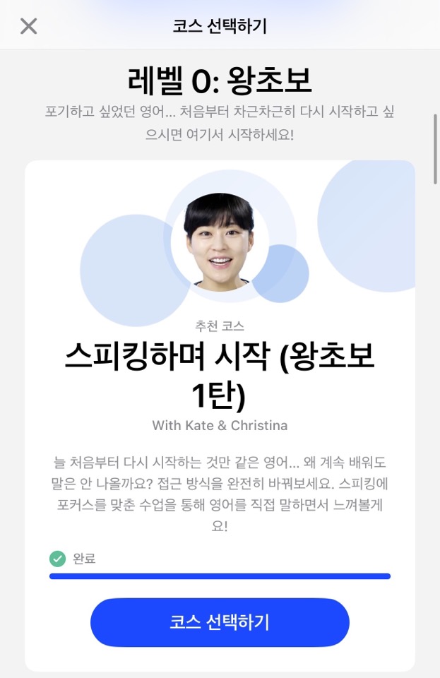 왕초보와 기초 코스를 지나면, '원어민처럼 스피킹' 중급 코스가 있습니다. 영어로 소통할 때, 원어민들이 실제로 쓰는 표현을 알려주어 훨씬 자연스러운 영어를 구사할 수 있습니다. 한 수업 당 길어야 20분 정도라 스트레스 없이, 시간에 구애받지 않고 수강할 수 있습니다.