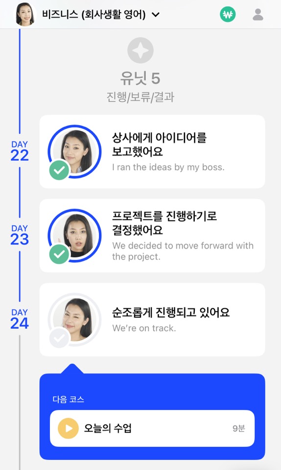 저는 요즘 '비즈니스 회사생활 영어' 코스를 수강 중입니다. 비즈니스 코스라 훨씬 생소한 표현들이 나오는데, 만약 외국 취업을 생각하거나 영어 면접을 준비한다면 꽤 도움될 것 같습니다.