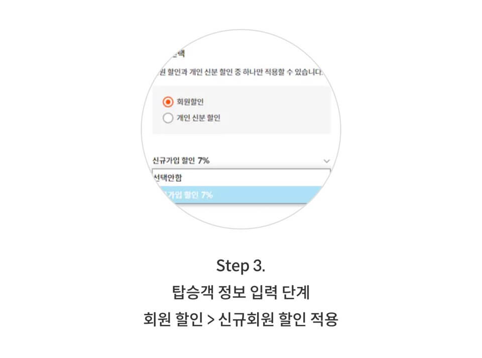 3단계: 여정을 선택한 후 탑승객 정보 입력 단계에서 회원 할인→회원가입 7%(국제선의 경우 5%)을 선택합니다.
