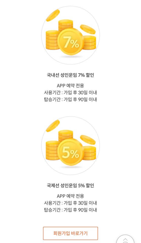 1인(ID) 당 제공되는 신규회원 할인 혜택은 국내선과 국제선 각각 최초 1회만 가능합니다.
