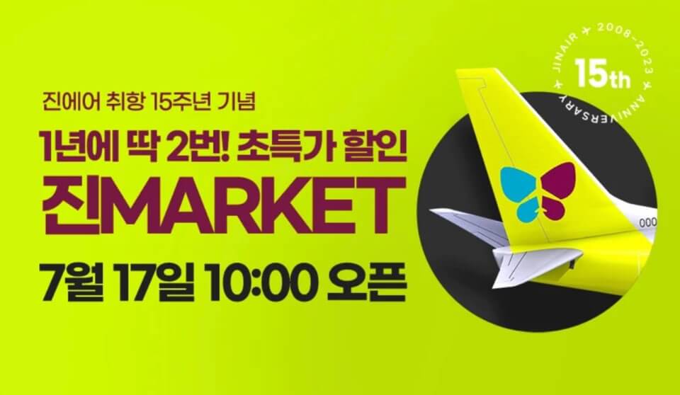 진에어 취항 15주년을 기념해서 항공권 초특가 할인 이벤트인 진마켓을 오픈한다고 미리 알리고 있어요!