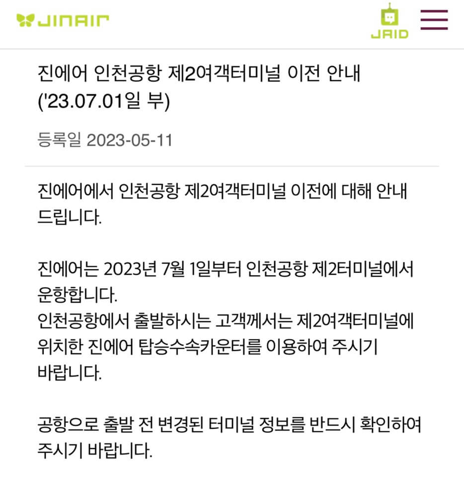 진에어 공지사항에도 2023년 7월 1일부터 인천공항 제2터미널에서 운항한다고 안내되어 있습니다.
