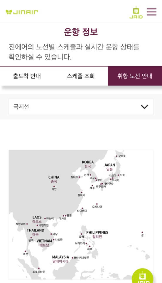 진에어 애플리케이션 또는 홈페이지의 메뉴에서 '운항 정보'에 들어가시면, '취항 노선 안내'가 있습니다.