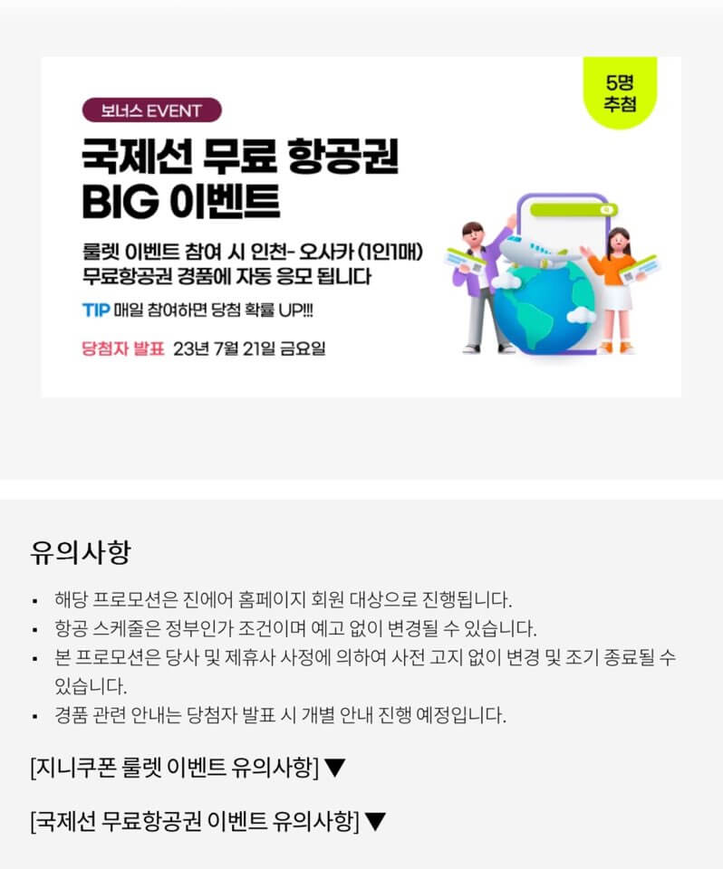 룰렛 이벤트에 참여하면, 자동으로 인천-오사카 무료 항공권 경품에 응모됩니다.
