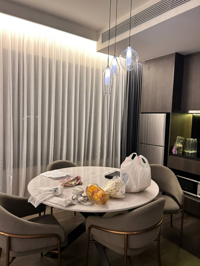 다이닝 식탁 위가 조금 더럽지만, 이렇게 네 가족이 모여 앉아 식사를 하거나 간식을 먹을 수 있는 공간도 있습니다.