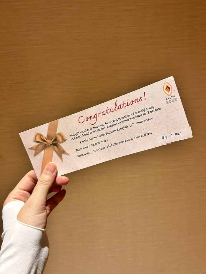 이스틴 그랜드 호텔 사톤의 1박 조식포함 무료 숙박권이 당첨되었습니다?!?!?!?